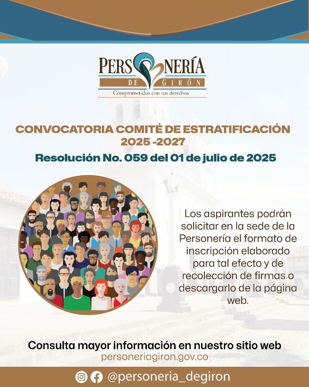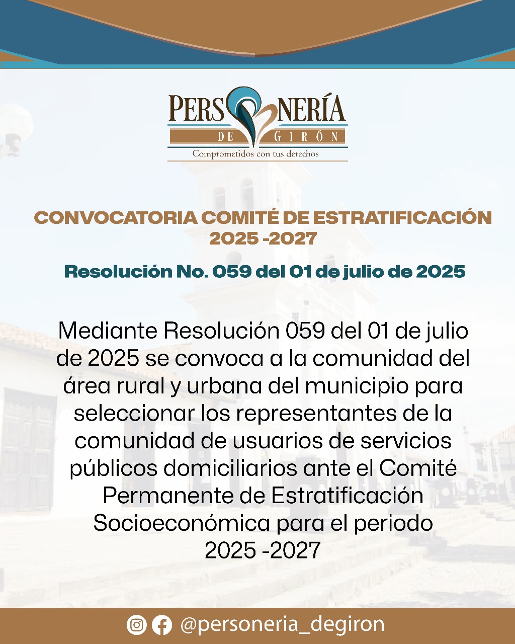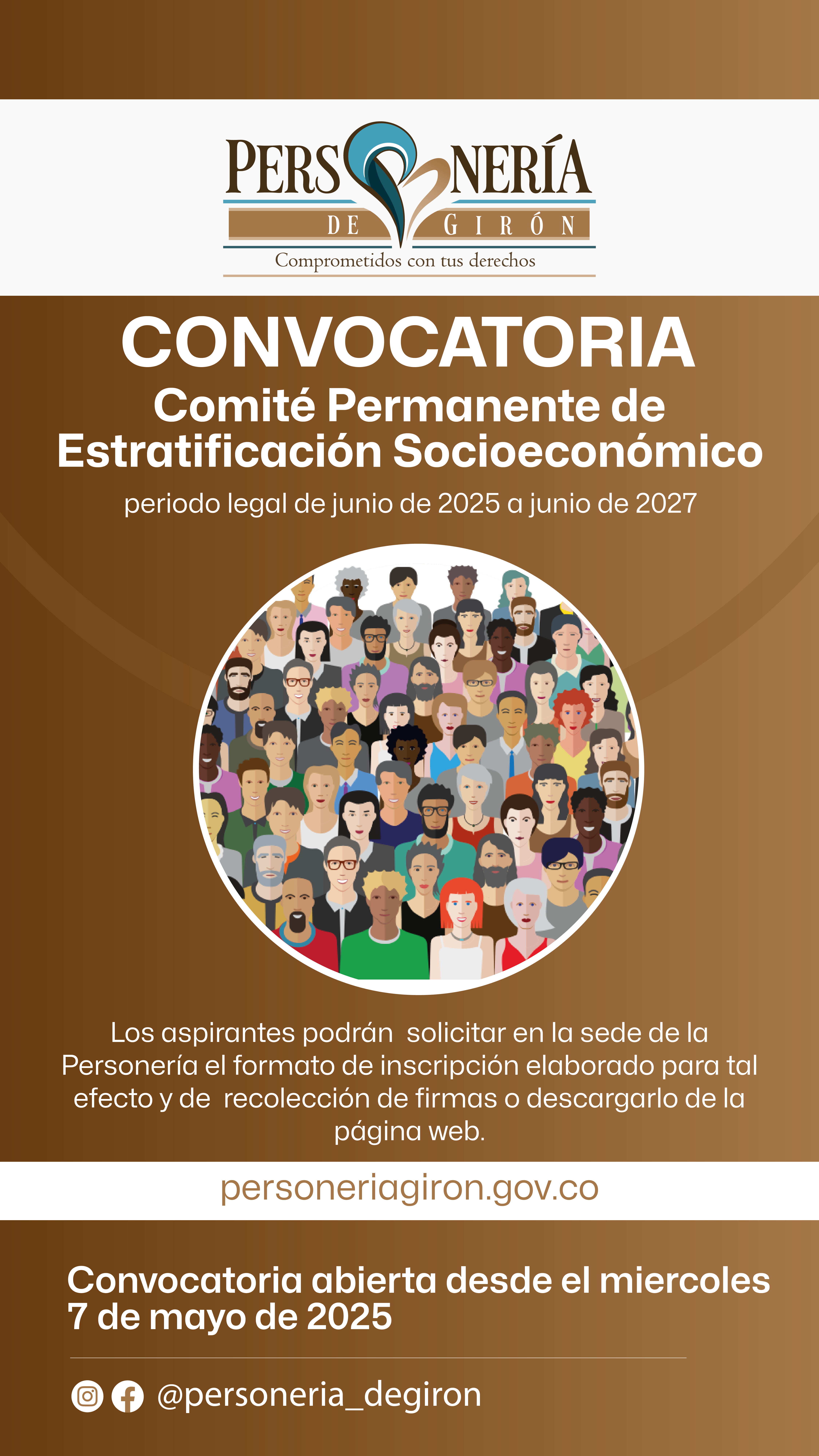 SEXTA CONVOCATORIA ABIERTA PROMOVIDA POR LA PERSONERIA DE GIRON – ELECCION REPRESENTANTES DE USUARIOS ANTE EL COMITE PERMANENTE DE ESTRATIFICACION SOCIECONOMICO PERIODO 2025 – 2027