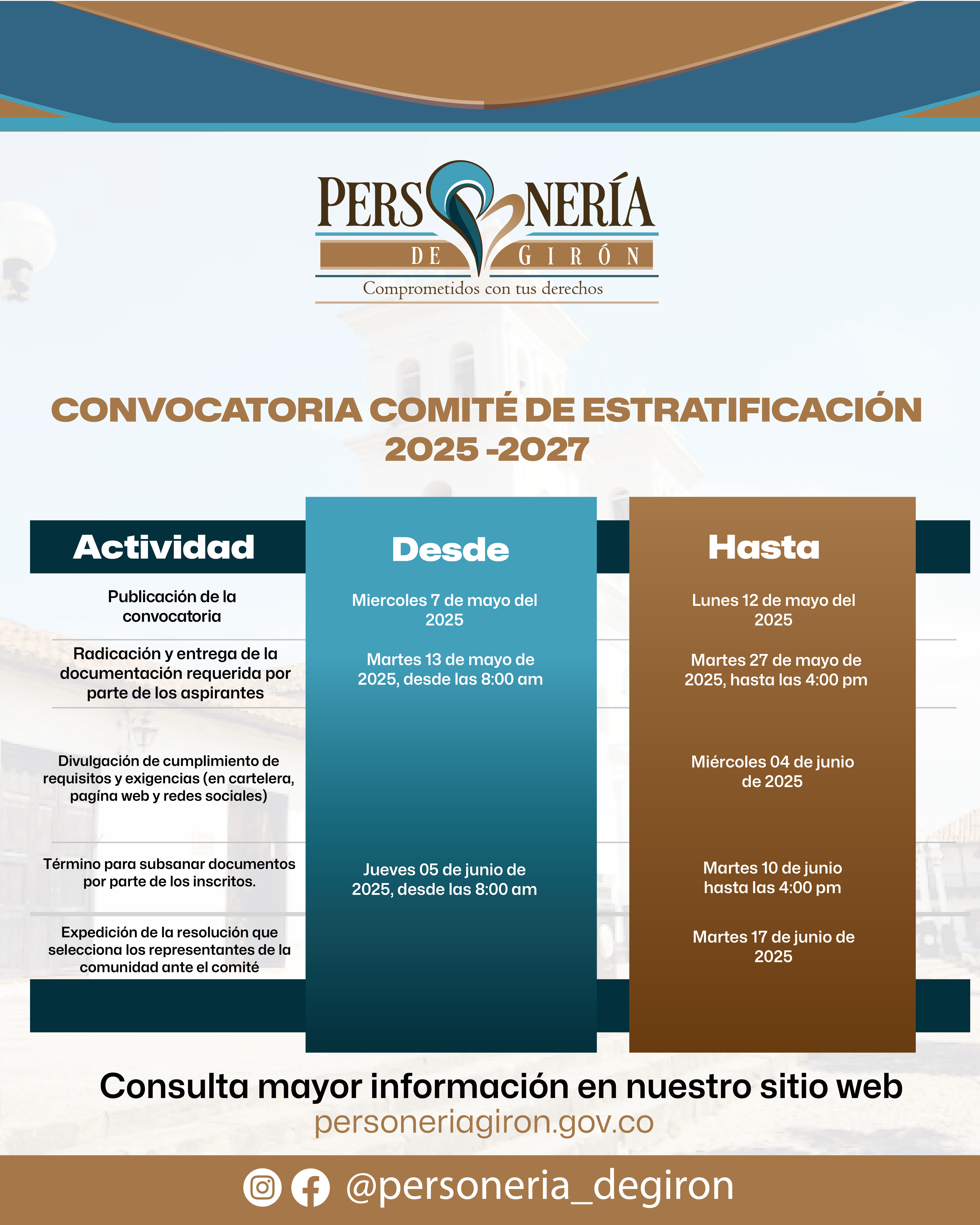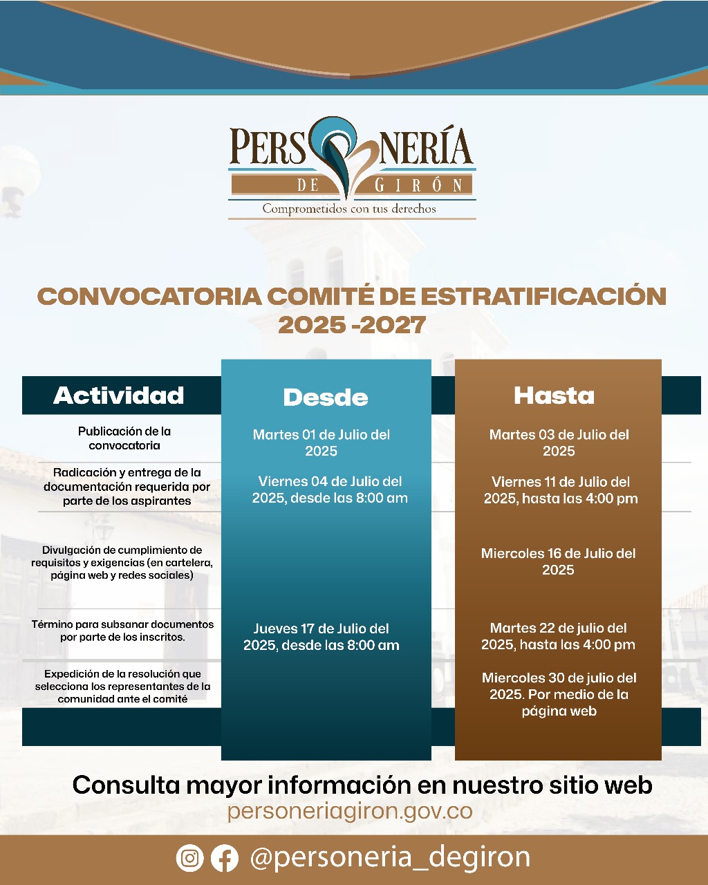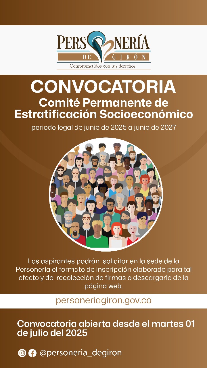 SEXTA CONVOCATORIA ABIERTA PROMOVIDA POR LA PERSONERIA DE GIRON – ELECCION REPRESENTANTES DE USUARIOS ANTE EL COMITE PERMANENTE DE ESTRATIFICACION SOCIECONOMICO PERIODO 2025 – 2027